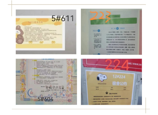 通过设立宿舍公约,解决生活中的小问题,可以使宿舍更文明,校园更温馨,同时也可以提高寝室生活质量,增强宿舍幸福感和凝聚力,提高宿舍成员的自觉性和自律性。此次活动要求各寝室成员共同商定、共同创作,共同制定寝室行为规范与学习、生活目标,短短两天时间里,大家相互探讨、分工合作,寝室成员分工明确,各司其职,共同为宿舍荣誉出谋划策。本次活动采用线上评比的方式进行,经过激烈角逐,材料学院5#604,5#611,12#223,12#224四个宿舍脱颖而出,荣获本次评比活动的一等奖宿舍。5#413,5#513,9#305,9#405,12#214,12#218获得二等奖宿舍,5#501,5#506,5#517,9#403,9#404,12#217,12#222,12#312,12#313获得三等奖宿舍,其余参与宿舍均获得优秀宿舍称号。