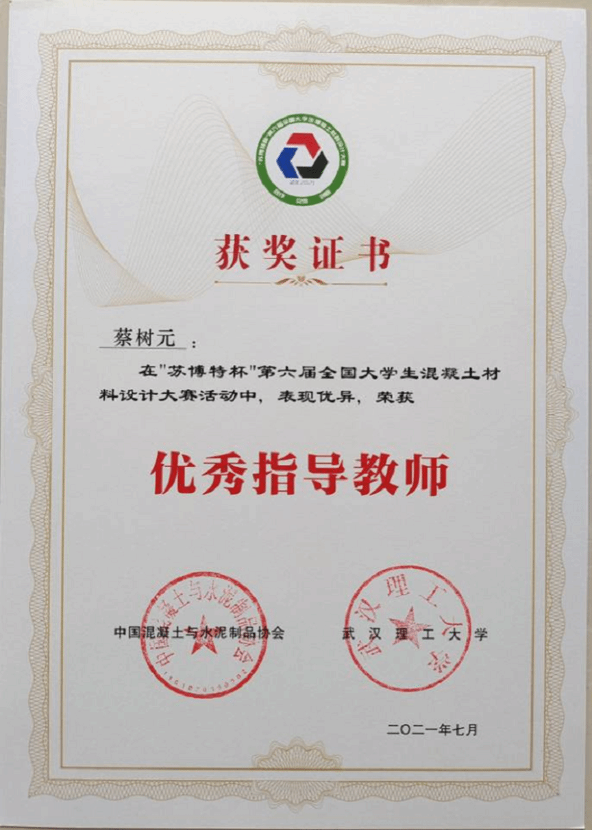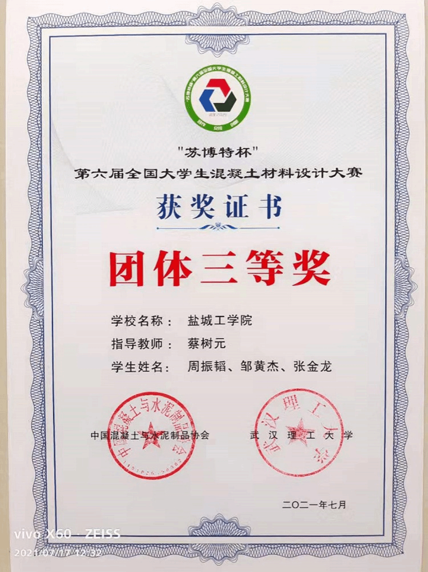 713日至15日,第六届全国大学生混凝土材料设计大赛在武汉理工大学南湖校区举行,金沙集团1862cc成色2019级材料科学与工程专业学生周振韬、张金龙与邹黄杰组成的盐栗队获得团体三等奖,蔡树元老师获优秀指导教师奖。