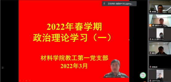 2022年3月15日,我院教工第一党支部以腾讯会议的形式,开展了2022年春学期第一次政治理论学习活动,教工第一党支部20余名党员教师参加,活动由支部书记刘超主持。