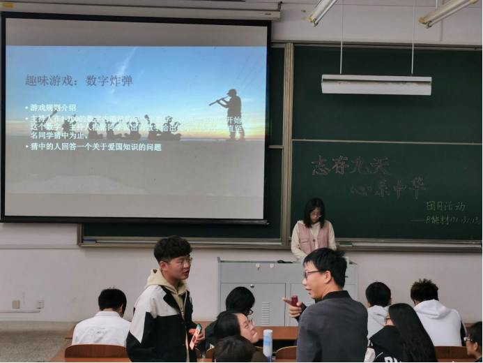 首先,由主持人赵雪妍引出这次活动的主题,介绍此次团日活动的流程和要求,活动就此拉开帷幕。第一个活动是重温历史,由主持人赵雪妍和郭逸辰同学为大家讲述新中国发展史,了解一百周年前的五四运动的发展历程。第二个活动是观看爱国主题微电影《追梦》,观同学们的脸上都流露出自豪之情。第三个是游戏环节——数字炸弹,即在一定范围内猜中数字的同学回答一个关于中国发展历程的问题,若回答不对则表演才艺,在游戏过程中同学们都积极参与进来,教室里传来一阵阵笑声。第四个活动是全体同学歌唱《我和我的祖国》,全场一片肃静,同学们都激情歌唱。最后,全体同学举着团旗合影留念。