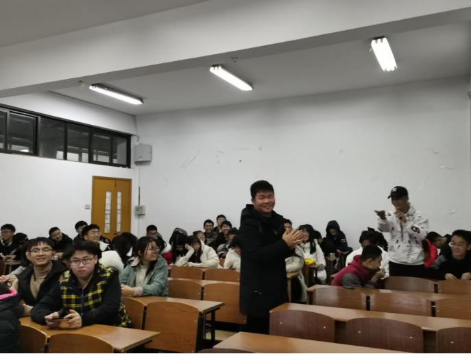活动由李书羽,刘溪同学共同主持。活动开始由李书羽同学主持猜拳环节以打开气氛。猜拳成员由两个班级各派成员,进行对抗。热烈的叫喊声与笑声拉近了班级间的距离。在同学们逐渐熟悉和亲近的互相打量中,李书羽等同学带着情景剧《新闻联播》粉墨登场。这位主持人借助新闻联播的形式将身边的校园欺凌事件娓娓道来,语言讲述的同时,几位同学表演具体事件情形。开始时总有三三两两的嬉笑声,渐渐教室里沉默,叹息,叹息,沉默,演出才算是真正宣告结束。