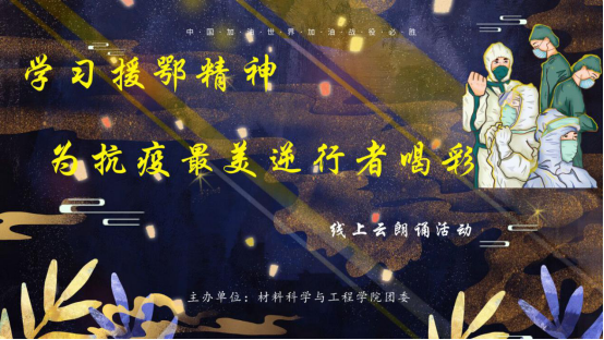 “共同迎着春天的脚步,走向一个崭新的黎明” B材料193庄旭敏同学对抗击疫情胜利满怀希望。“青春是蓝色的,那是天空的颜色。年轻的我们总是积极的,有着无限的遐想与期待”材物181徐婷同学清脆的嗓音引领我们对“青年学生”发起深思。“众志成城,武汉加油,中国加油,世界加油”的呐喊,是每一位同学的真切期盼。