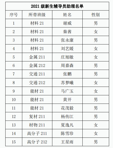 根据《金沙集团1862cc成色关于公开竞选2021级辅导员助理的通知》相关要求,经学生自愿报名、学院审核、面试选拔等环节,拟确定谢威等15名同学为2021级新生辅导员助理推荐人选,如对评定结果有异议,五日内以书面形式向学院党委反映。