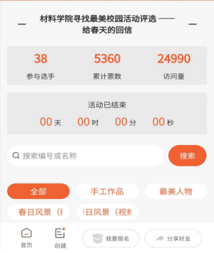 41日,材料科学与工程学院开展“寻找最美校园——给春天的回信”摄影大赛,经过为期3天的宣传,共征集103张反映校园生活、学习、文化的摄影作品。经过初筛,共有38个优秀作品入围票选环节。44日下午500经过紧张公正的网上投票评选,比赛落下帷幕,累计票数5360票,访问量达到24990次,获奖作品为一等奖4名:褚心蕊、冯梦婷、赵华宇、余艳琪;二等奖4名:杜歆叶、倪城波、张琪鑫、谷容倩;三等奖5名:顾宣芝、孙凡茜、王远、朱迎、孙中艺