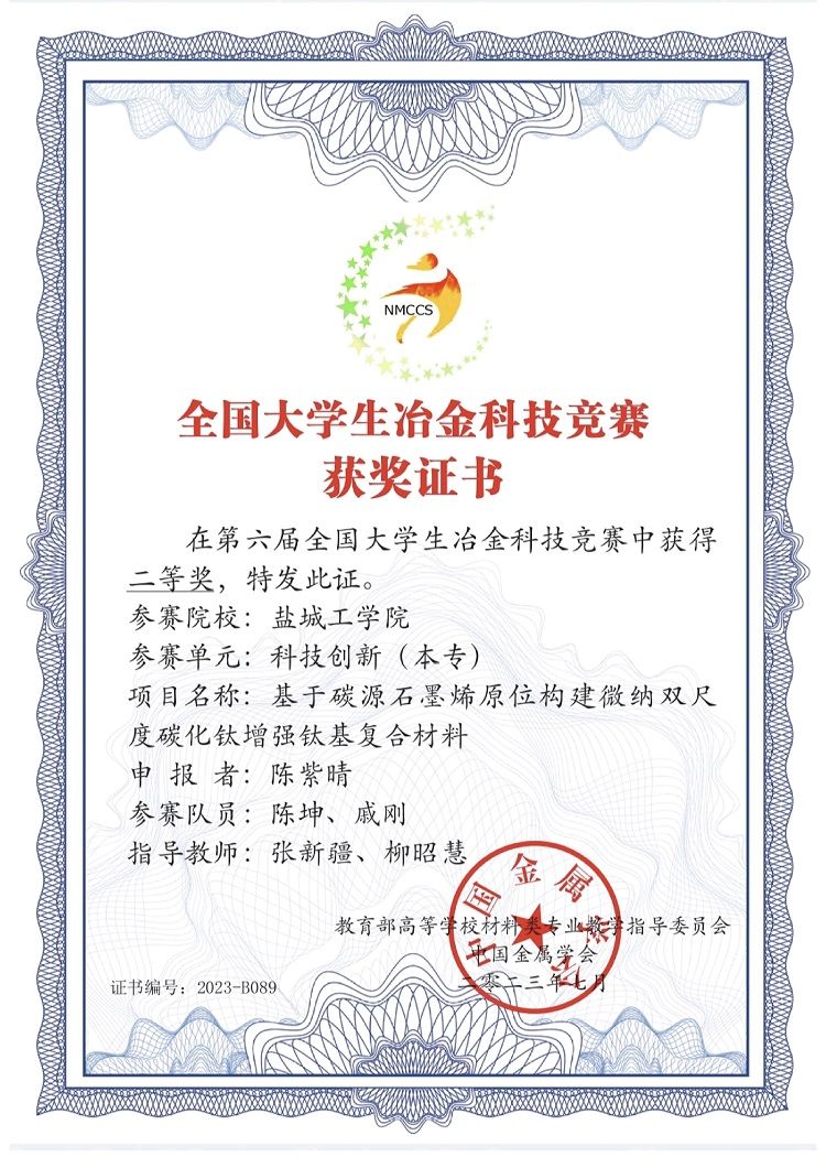 近日,第六届全国大学生冶金科技竞赛组织委员会公布了总决赛结果。我院本科生陈紫晴、陈坤和戚刚在教师张新疆、柳昭慧指导下,完成的科技创新作品《基于碳源石墨烯原位构建微纳双尺度碳化钛增强钛基复合材料》获全国总决赛二等奖。