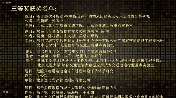 北京交通工程学会于2020年 7月-9月开展本次征文活动。征文活动主要面向会员单位及个人,各高校、科研单位。征文范围涉及交通基础设施规划与设计、交通组织与管理、交通规划、智能交通、公共交通、交通控制、交通安全、交通节能减排、交通政策、交通经济、城市轨道交通、区域一体化交通等方面。经过专家委员会的严格评选,最终评选出了一等奖2名,二等奖5名,三等奖10名,优秀奖10名。