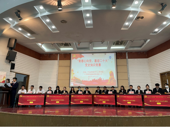 党史知识竞赛设必答题、抢答题和风险题三个环节,内容涉及党的光辉历史中的重大历史事件和重要历史人物、习近平新时代中国特色社会主义思想等,选手们沉着应战、积极答题,竞赛现场穿插观众问答,比赛气氛紧张而热烈,现场观众掌声、欢呼声此起彼伏。比赛后B材料202班陆思雨、B能材211班任志刚同学的诗朗诵《喜迎二十大 永远跟党走》表达了青年学生在党的领导下,与时代同心同向同行,踔厉奋发,笃行不怠的决心。