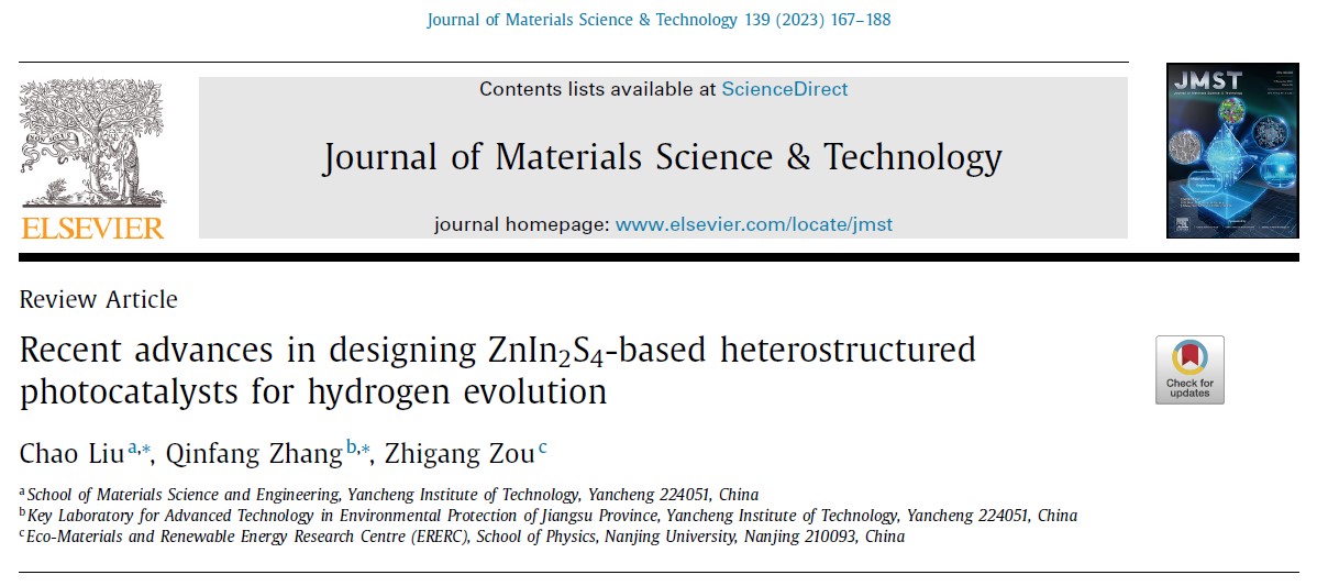 近日,我校张勤芳教授课题组刘超博士为第一作者(及通讯作者),张勤芳教授为通讯作者、我校为第一单位的综述论文《Recent advances in designing ZnIn2S4-based heterostructured photocatalysts for hydrogen evolution》(Journal of Materials Science & Technology 2023, 139, 167-188),主要总结ZnIn2S4-基异质结光催化剂在水分解产氢方面最新研究进展。南京大学邹志刚院士对本综述撰写进行了指导。该期刊入选中国科技期刊卓越行动计划—重点期刊,2021年影响因子为10.32,主要刊登材料学科高水平的研究成果,属于材料学科Top期刊与中科院1区期刊。