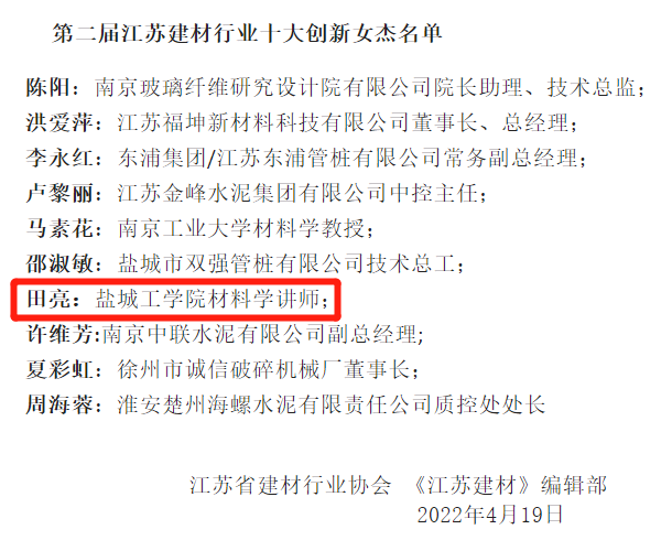 为迎接党的二十大胜利召开,树立江苏建材行业女性典范,展示行业杰出女性做出的重大贡献和志存高远、奋发有为的精神风貌。日前,江苏省建材行业协会及《江苏建材》编辑部组织开展了第二届“江苏建材行业十大创新女杰”推荐评选活动。经企业推荐、行业协会及专家评审、网络公示,我校金沙集团1862cc成色田亮老师成功入选。