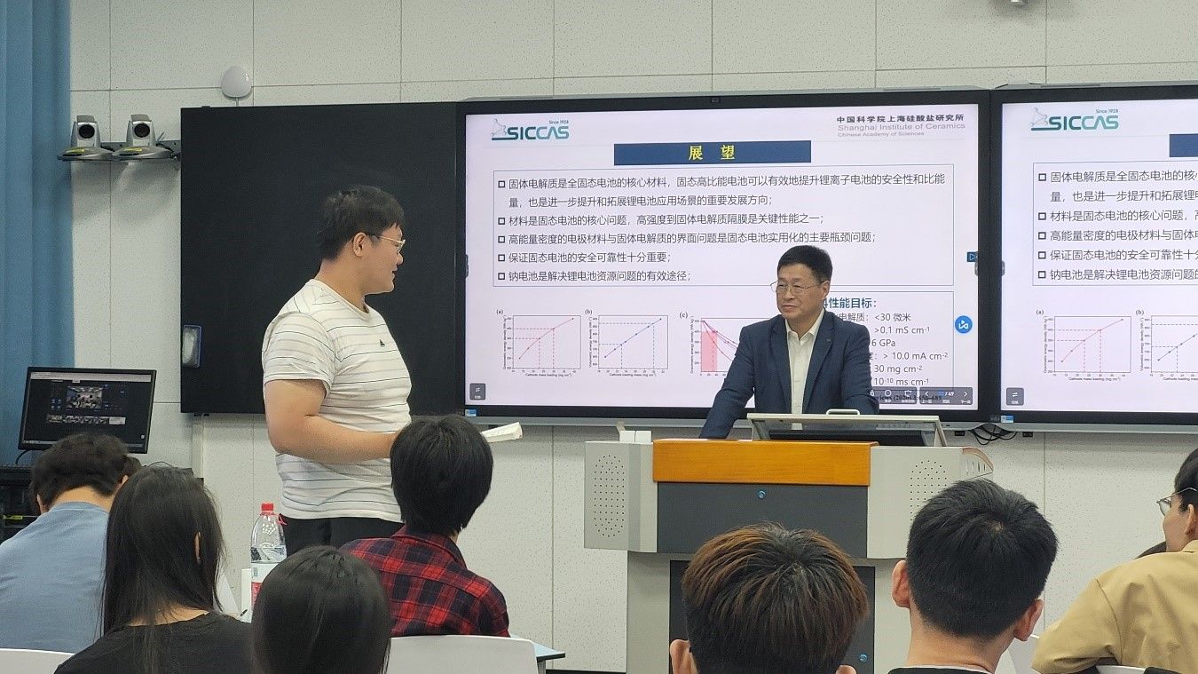 温兆银教授首先对企业进行了简要介绍,接着基于固态离子学,概括性地介绍了包括固态锂离子电池、钠硫电池、Zebra电池、固体氧化物燃料电池等在内的各种固态电池体系,并展示了公司电池中试生产线以及由产线生产出的各类固态电池产品,激起了学生们的浓厚兴趣。温老师教导学生,应用型实验研究一定要基于应用价值的考量,才能够真正实现有意义的科研,从而为我国科技领域服务,助力中华民族伟大复兴。本次讲座是《新能源材料》课程前沿内容的补充,为学生日后的学习打下了良好的基础。