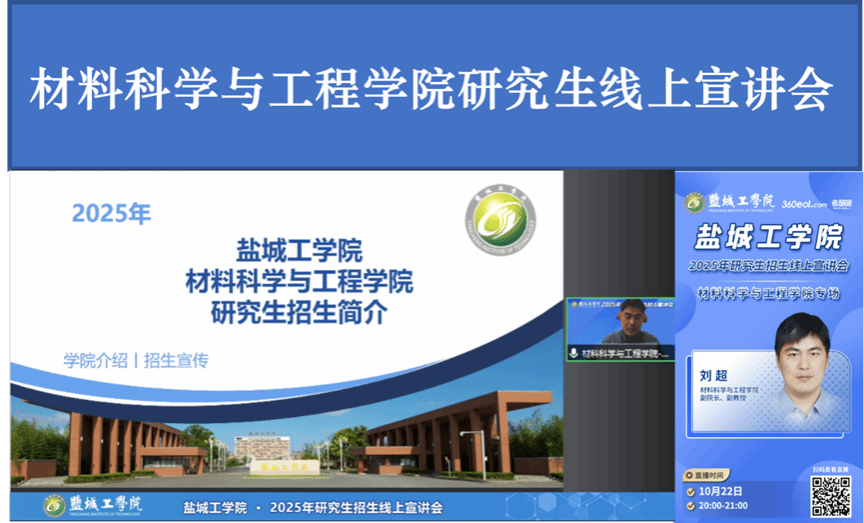 为了全面提升我校2025年材料科学与工程、纳米科学与工程以及交通运输硕士研究生的招生宣传效果,针对当前考生普遍关注的招生工作焦点问题,金沙集团1862cc成色于10月22日晚上8点在360教育直播平台开展了硕士研究生招生线上宣讲会,金沙集团1862cc成色副院长刘超进行宣讲,向广大考生和考生家长详细介绍了我院研究生招生政策的各项情况。