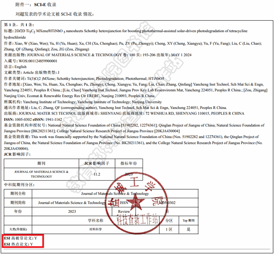 近期,根据Essential Science Indicators (ESI)数据库检索结果显示,我校金沙集团1862cc成色研究生肖雯(第一作者)、刘超博士(通讯作者)和张勤芳教授(通讯作者),我校为第一单位发表在《Journal of Materials Science & Technology》(中科院一区Top,影响因子:11.2)的研究论文“2D/2D Ti3C2 MXene/HTiNbO5 nanosheets Schottky heterojunction for boosting photothermal-assisted solar-driven photodegradation of tetracycline hydrochloride”(J. Mater. Sci. Technol., 2024, 180, 193-206),被同时收录为ESI材料学科“高被引论文”(Highly Cited Papers)和“热点论文”(Hot Papers)。
