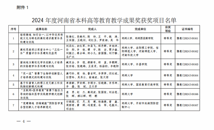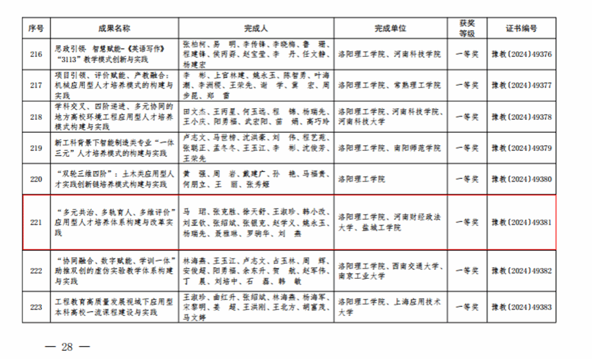 近日,河南省教育厅发布《关于公布2024年度河南省高等教育教学成果奖获奖项目名单的通知》,我校作为完成单位、罗驹华教授作为完成人的《“多元共治、多轨育人、多维评价”应用型人才培养体系构建与改革实践》获得高等教育教学成果一等奖。