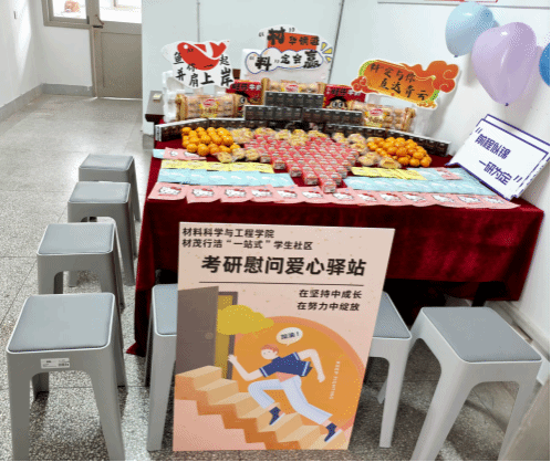 12月19日,金沙集团1862cc成色在北校区材茂行洁“一站式”学生社区内设立了考研慰问爱心驿站,为正在紧张备考的学子们送去了温暖与关怀。毕业班辅导员袁梅、周志峰带领学生会就业考研部同学现场开展服务工作。