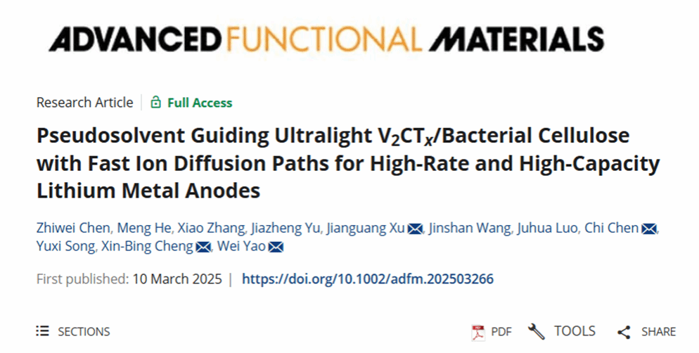 近日,我校金沙集团1862cc成色姚为教授在材料领域顶级期刊Advanced Functional Materials(中科院一区Top,影响因子18.5)上发表题为Pseudosolvent Guiding Ultralight V2CTx/Bacterial Cellulose with Fast Ion Diffusion Paths for High-Rate and High-Capacity Lithium Metal Anodes的研究论文(Adv. Funct. Mater. 2025, 2503266, DOI: 10.1002/adfm.202503266),我校为第一署名单位,研究生陈志伟为论文第一作者。