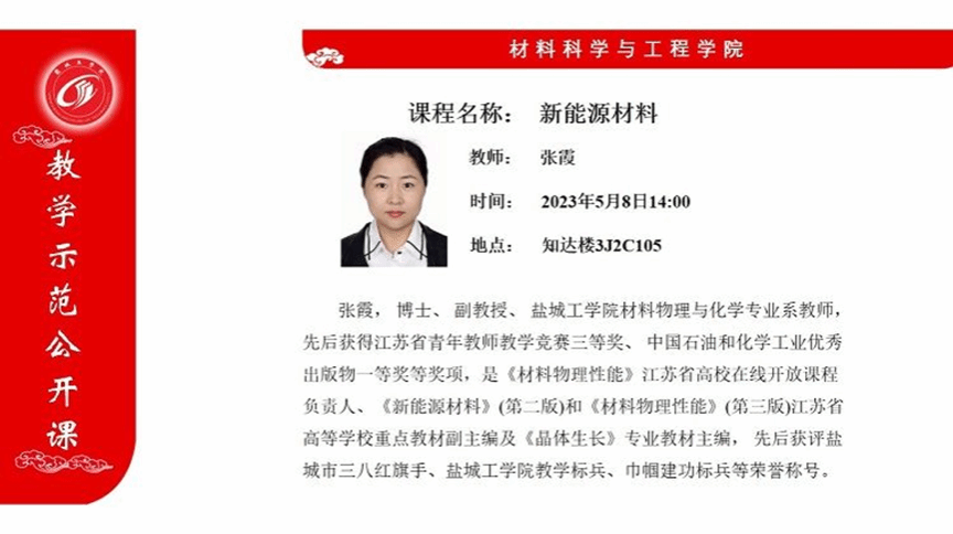 为提高教师教学能力,提升课堂教学效果,5月8日下午,学院邀请张霞老师开展《新能源材料》教学示范公开课活动。学院党委书记唐浩、副院长罗驹华(主持工作)、副院长诸华军,近五年入职教师和其他专业教师等40余人参加。