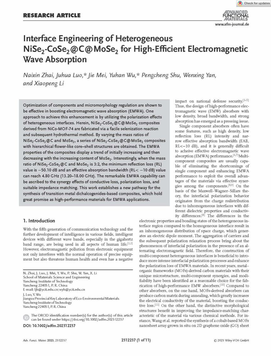 近日,我校金沙集团1862cc成色罗驹华教授课题组在材料领域顶级期刊Advanced Functional Materials上发表题为“Interface Engineering of Heterogeneous NiSe2-CoSe2@C@MoSe2 for High-Efficient Electromagnetic Wave Absorption”的研究成果(https://doi.org/10.1002/adfm.202312237)。这是我校研究生首次为第一作者,我校为唯一通讯单位在此期刊发表研究论文。Advanced Functional Materials由Wiley出版,报道材料科学各个方面的突破性研究,包括纳米技术、化学、物理和生物,是国际公认的材料领域顶级专业期刊,在业界享有极高的声誉。2023年最新影响因子为19.924。
