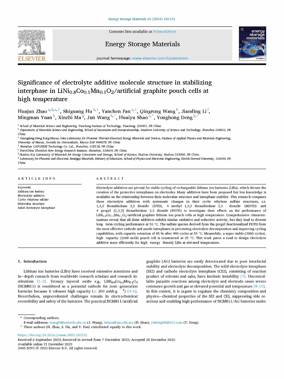 近日,我校金沙集团1862cc成色赵华军博士在国际材料学科顶级期刊Energy Storage Materials上发表题为“Significance of Electrolyte Additive Molecule Structure in Stabilizing Interphase in LiNi0.8Co0.1Mn0.1O2/Artificial Graphite Pouch Cells at High Temperature”的研究成果,论文链接https://doi.org/10.1016/j.ensm.2023.103151。Energy Storage Materials发表储能材料等领域的重大新发现,涉及材料的合成、制备、结构、性能和技术应用,以及它们在电化学、化学、电学、热学、磁性和机械能存储装置中的应用,是国际公认的材料领域顶级专业期刊,在业界享有极高的声誉。最新影响因子为20.4。