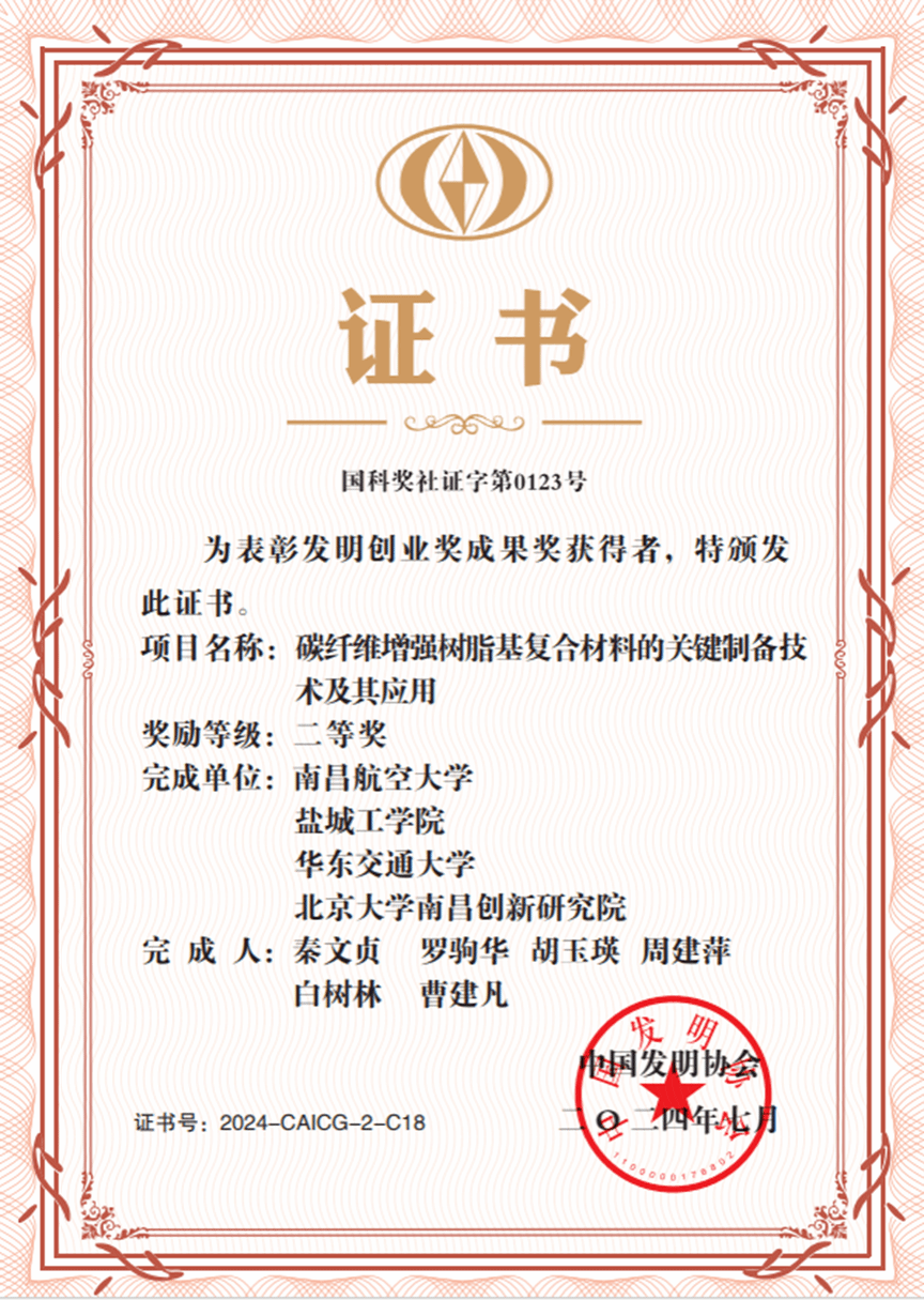 近日,中国发明协会颁发了2024年度发明创业奖证书,我校作为第二完成单位、金沙集团1862cc成色罗驹华教授作为第二完成人的《碳纤维增强树脂基复合材料的关键制备技术及其应用》荣获发明创业奖成果奖二等奖。