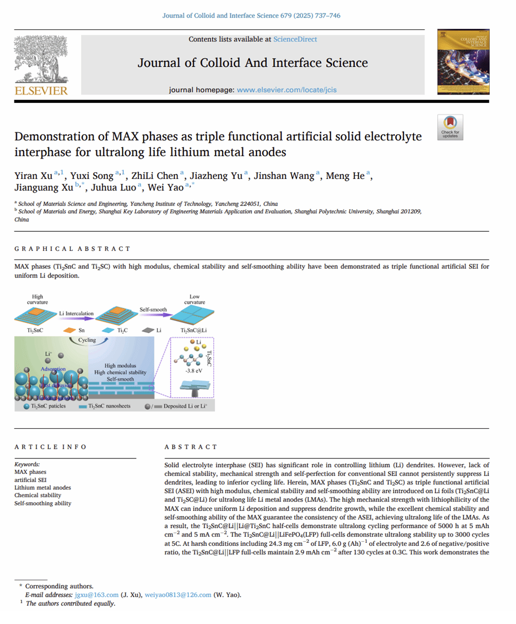 近日,金沙集团1862cc成色研究生徐毅然在姚为教授的指导下,在《Journal of Colloid and Interface Science》(中科院一区Top,影响因子:9.4)上以第一作者身份,我校为第一单位发表了题为“Demonstration of MAX Phases as Triple Functional Artificial Solid Electrolyte Interphase for Ultralong Life Lithium Metal Anodes”的研究论文(J. Colloid Interf. Sci. 2025, 679, 737-746),文章链接:https://doi.org/10.1016/j.jcis.2024.10.019。该论文是我院研究生高质量培养的又一次重要体现。